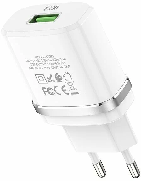 28738 Адаптер питания USB Hoco C12Q белый без кабеля (5V, 3.0A, QC3.0, FPC, 18W)